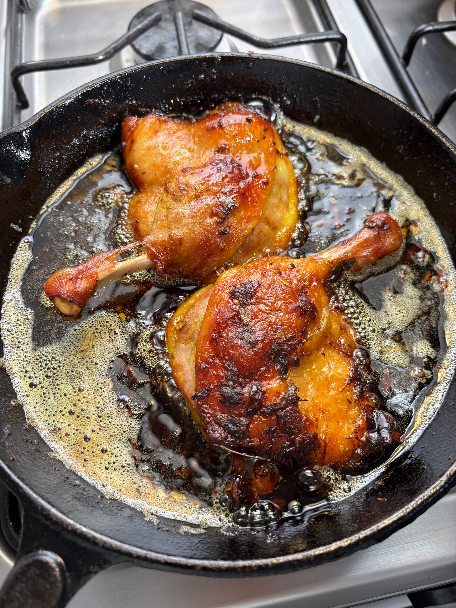 Once the duck is tender, crank the oven heat and return it for 5 minutes to crisp the skin.