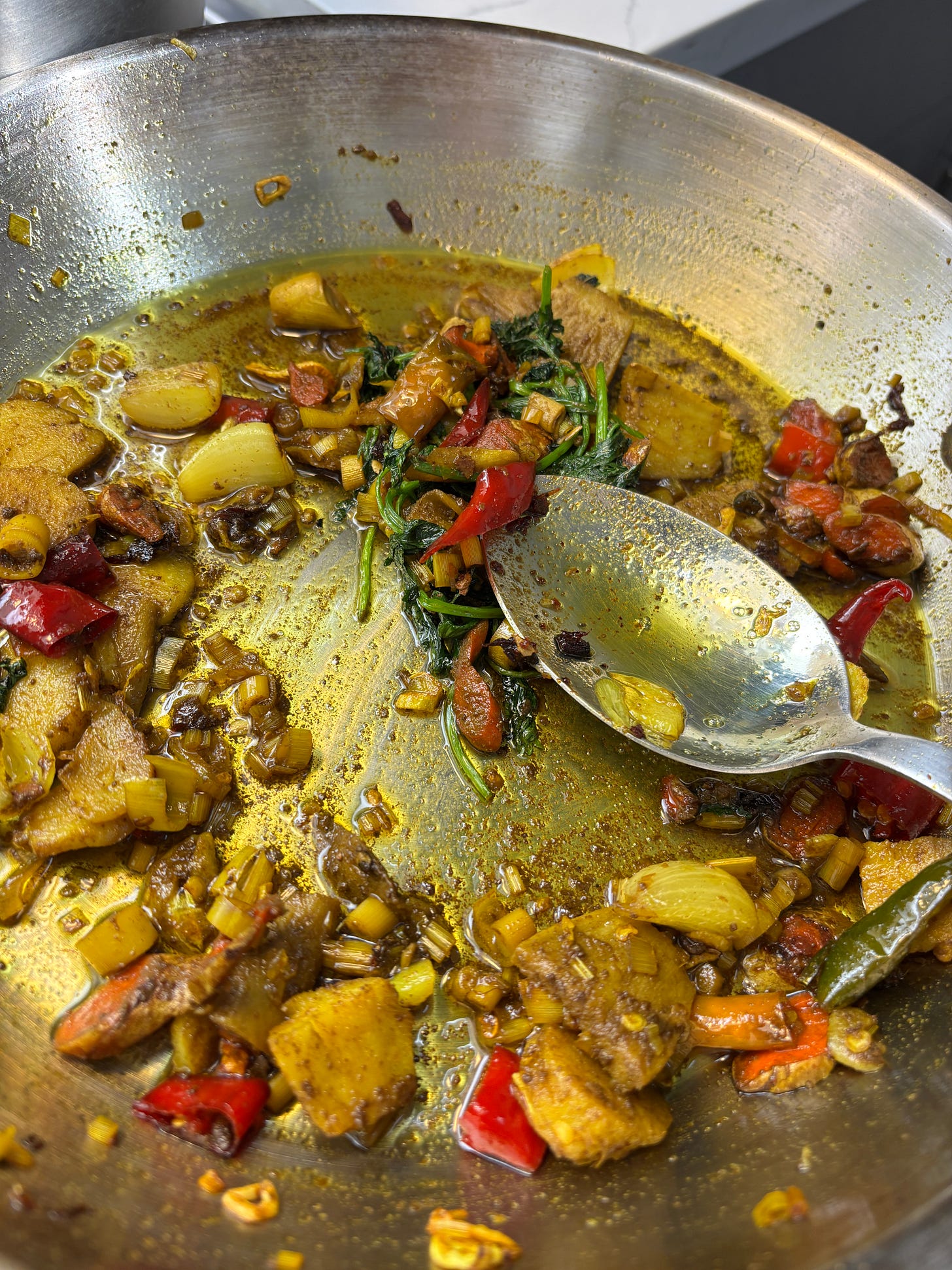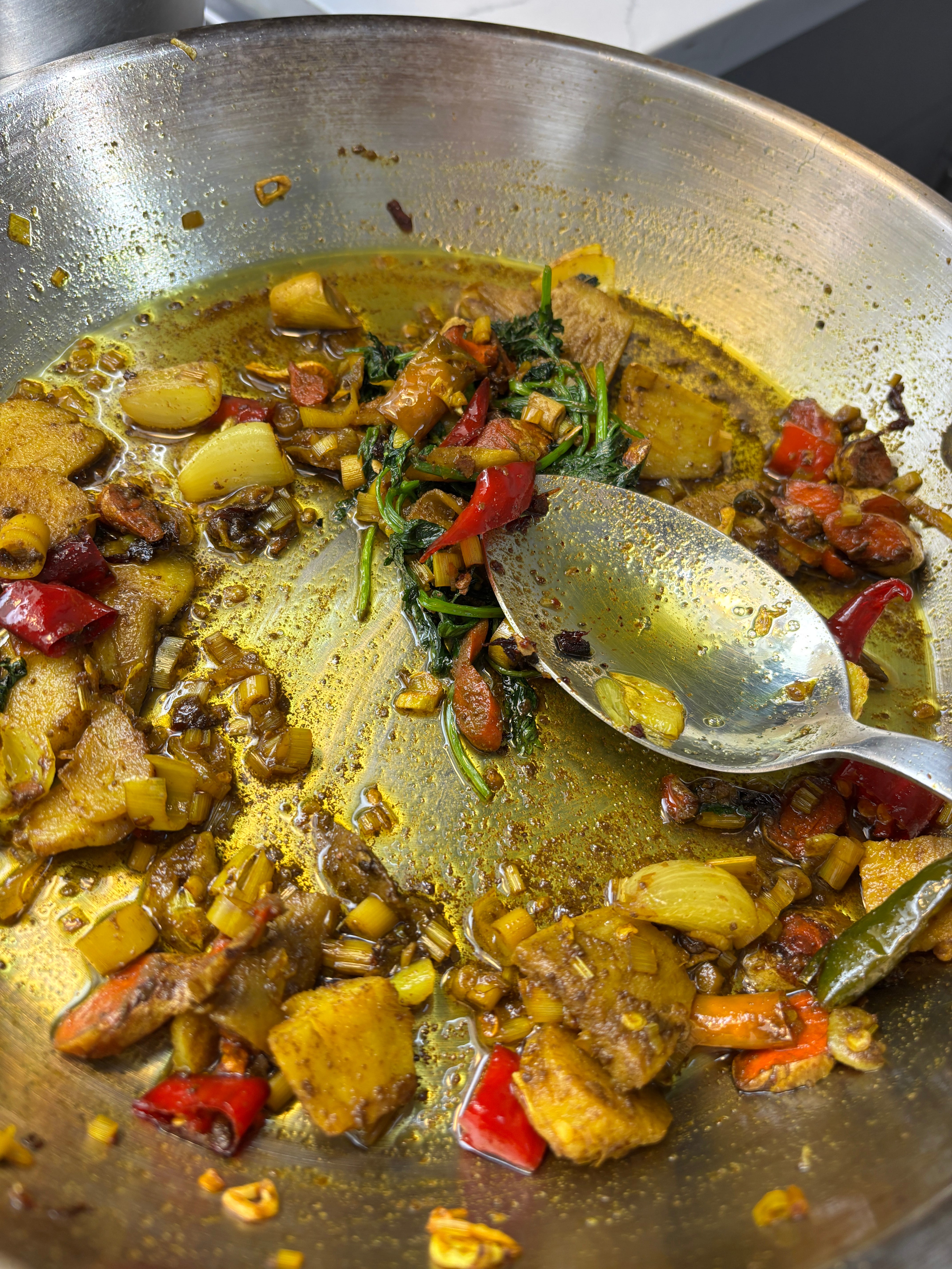 Briefly remove the duck from the oven (it’ll go back in for the final stretch). In a separate pan, add a few tablespoons of the rendered, aromatic duck fat. Cook the sambal aromatics with the shrimp paste and herbs for about 4 minutes, until softened and deeply fragrant.