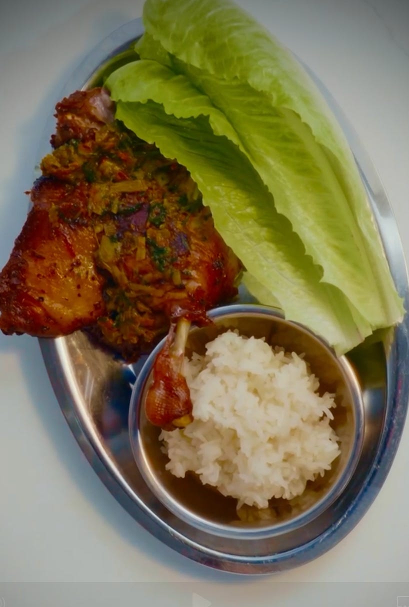 Take the duck out, smash it gently with a pestle, and smear generously with sambal. Serve with sticky rice, crisp lettuce, cucumbers, or anything fresh and cooling.