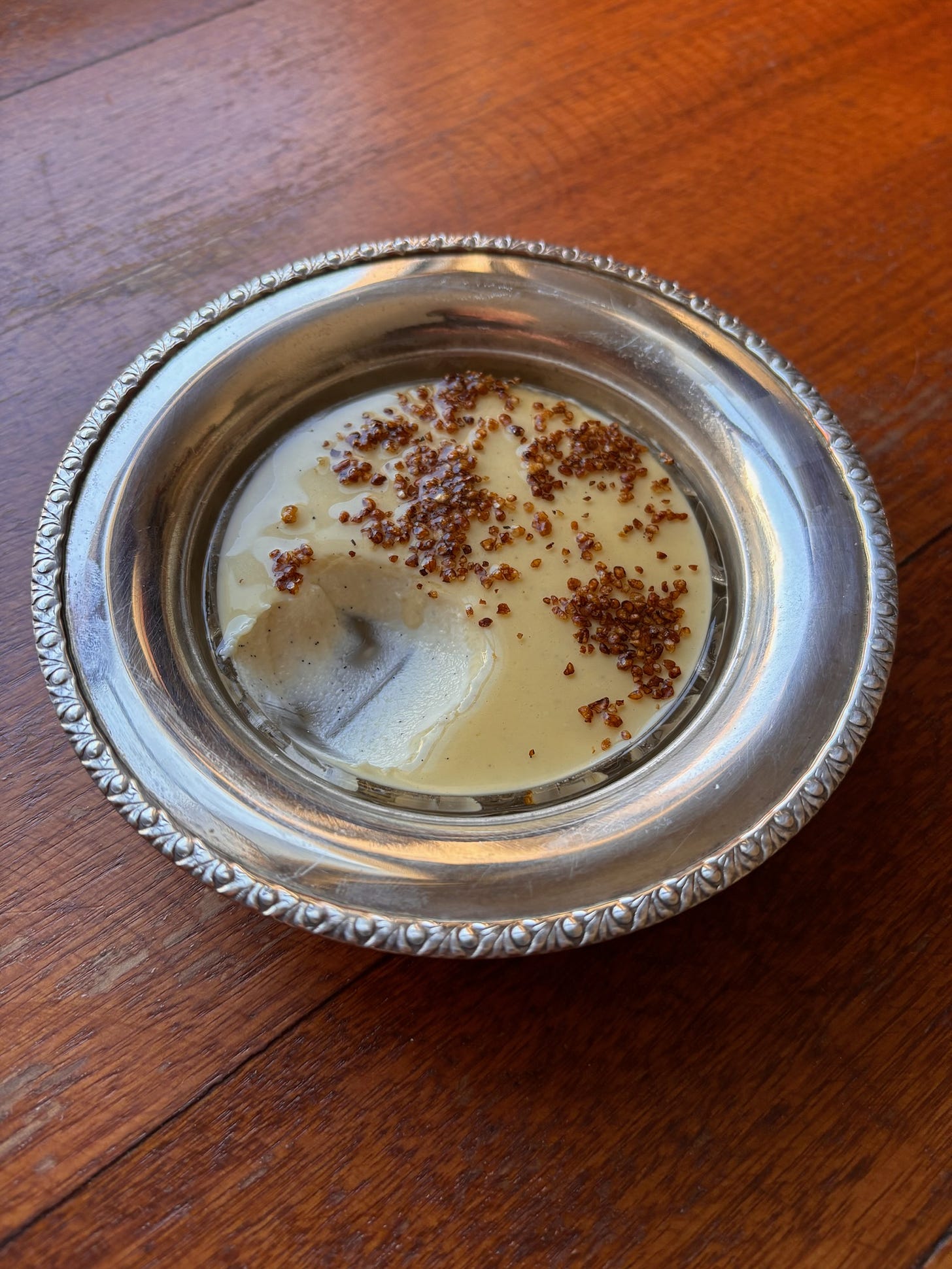 Soak your gelatine sheets in ice water for at least 5 minutes to activate and soften. Next, place a saucepan on the stove on medium heat. Add your cream, scraped fresh vanilla plus its outer shell, sugar, tahini and salt. Stir to dissolve the sugar, tahini and incorporate the vanilla. Once it has reached the boil, take off the heat. Squeeze out excess water from the soaking gelatine leaves and add it to the cream mixture. Stir again to dissolve.