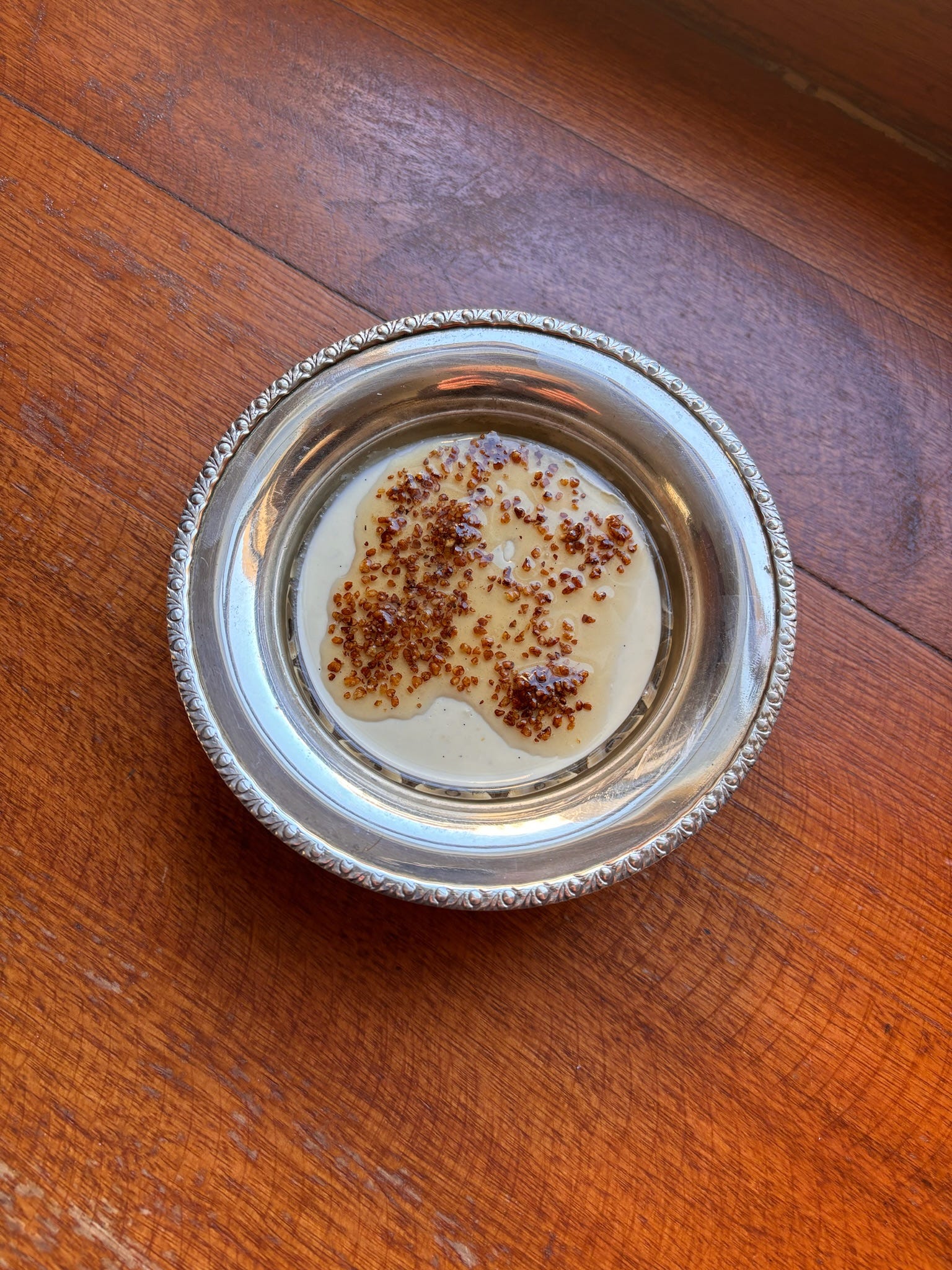To finish, take your panna cottas out the fridge. Drizzle with a little sobacha honey and season with a pinch of flakey salt.